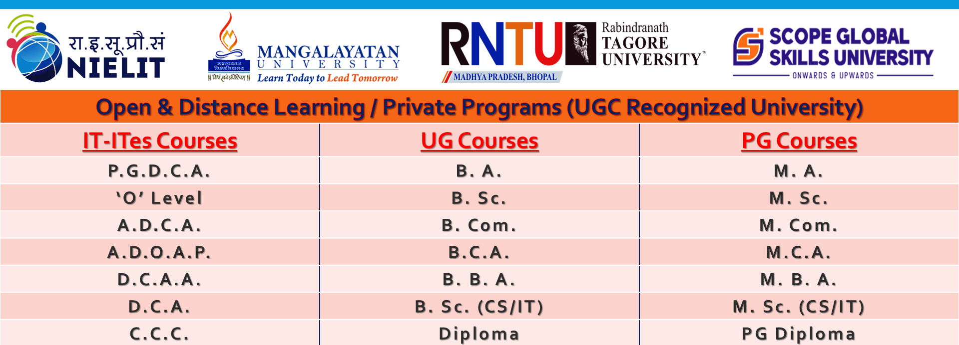 All University Course is UGC Recognized University & AICTE Recognized and Best NIRF Ranking Institute. Sr. No. Category(UG/PG) Course Name Subject / Specialization Eligibility Duration 01 UG Bachelor of Arts (B. A.) Combination of Any Three Subject:(Hindi, Sanskrit, English, Political Science, History, Geography,Sociology, Economics, Mathematics, Psychology, Education, Home Science.) 10+2 (Any Stream) 3 Years 02…